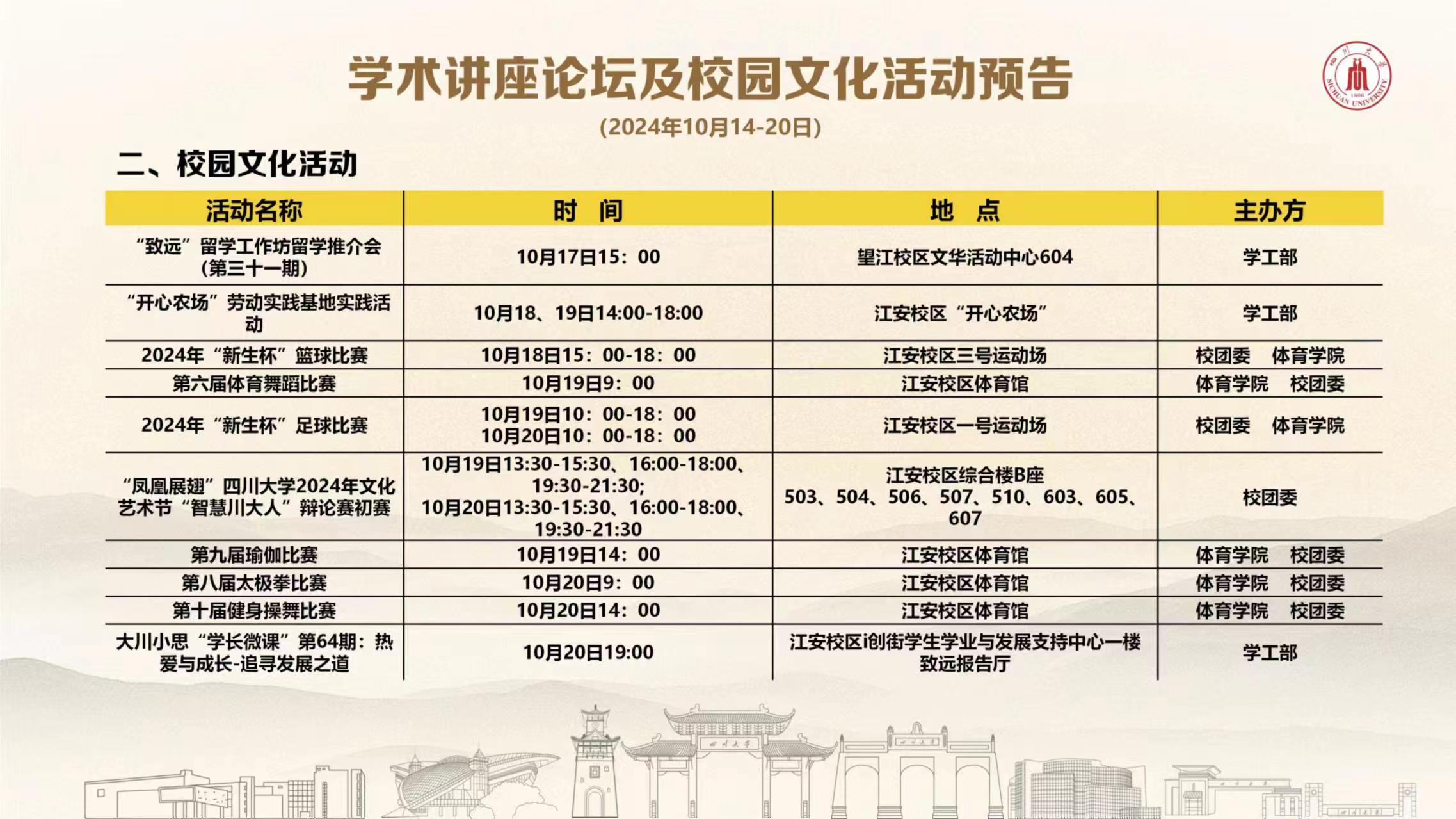 yl23455永利集团2024年10月14日-20日学术讲座论坛及校园文化活动预告