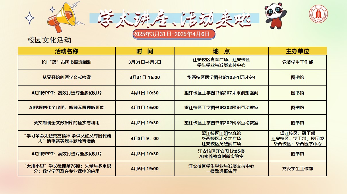 yl23455永利集团2025年3月31日-4月6日学术讲座论坛及校园文化活动预告