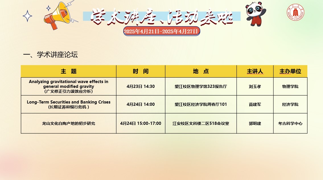 yl23455永利集团2025年4月21日-4月27日学术讲座论坛及校园文化活动预告
