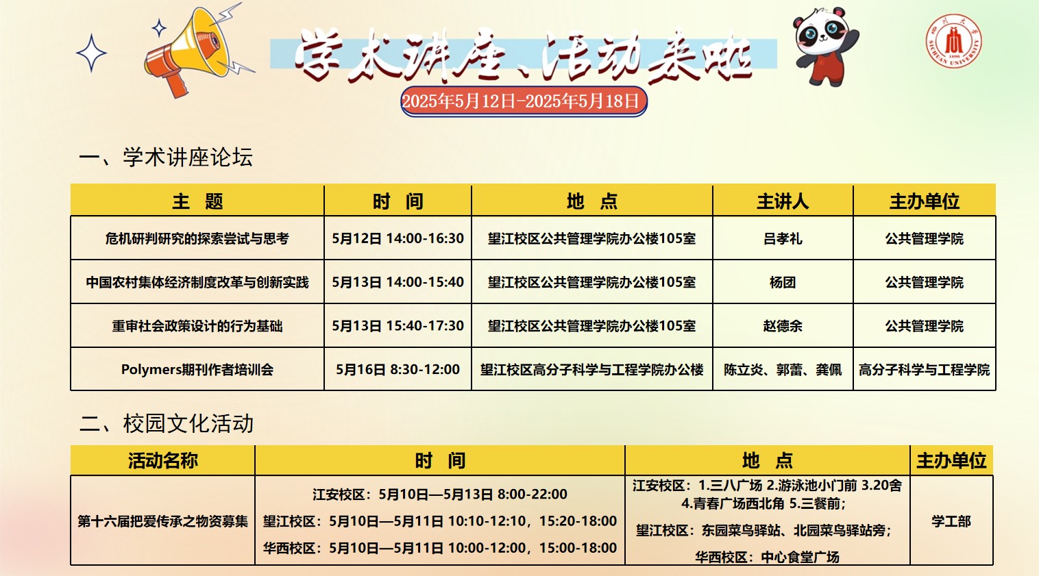yl23455永利集团2025年5月12日-5月18日学术讲座论坛及校园文化活动预告