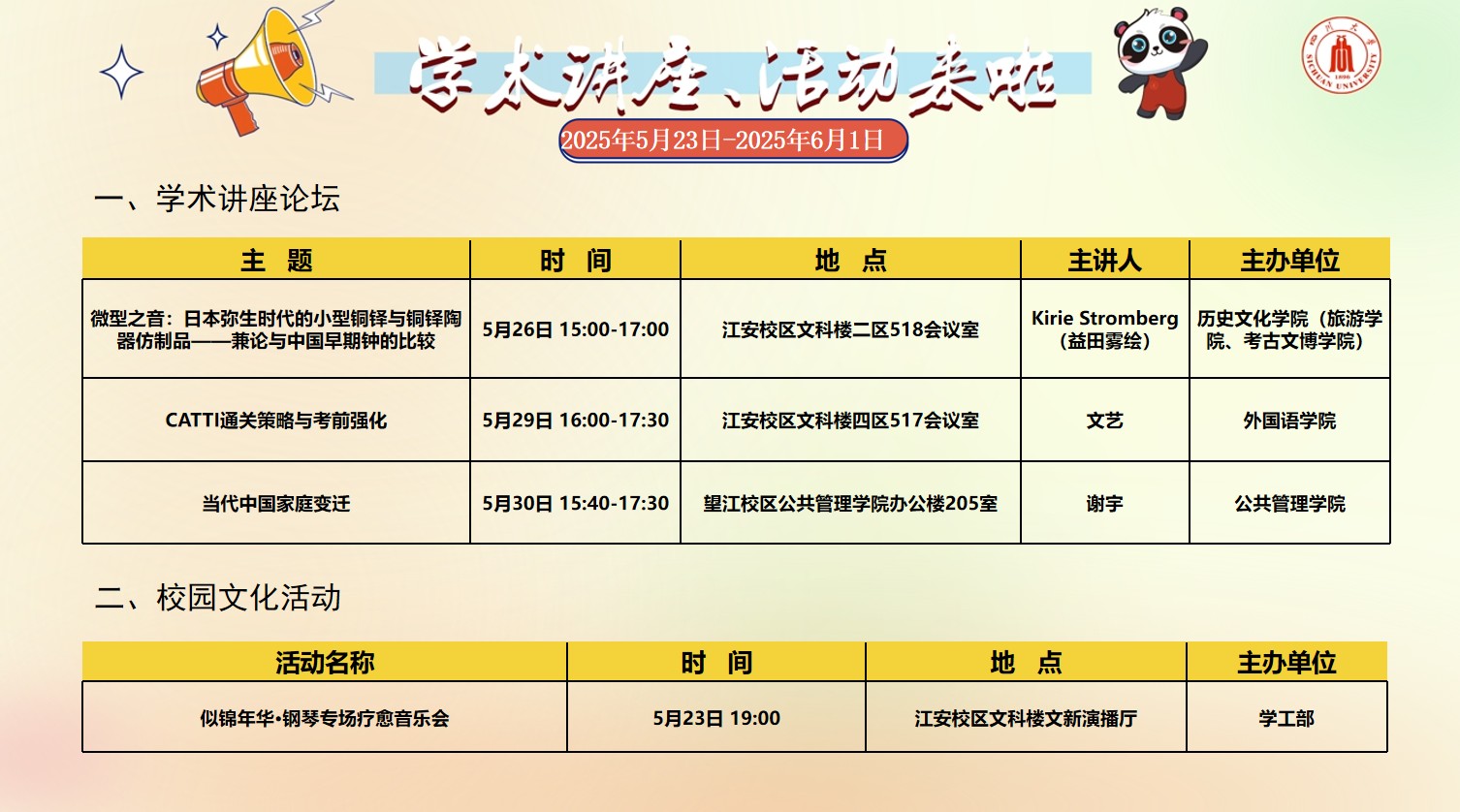 yl23455永利集团2025年5月23日-6月1日学术讲座论坛及校园文化活动预告