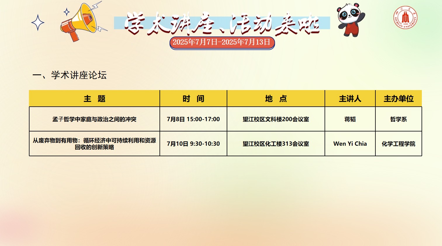 yl23455永利集团2025年7月7日-2025年7月13日校园文化活动预告