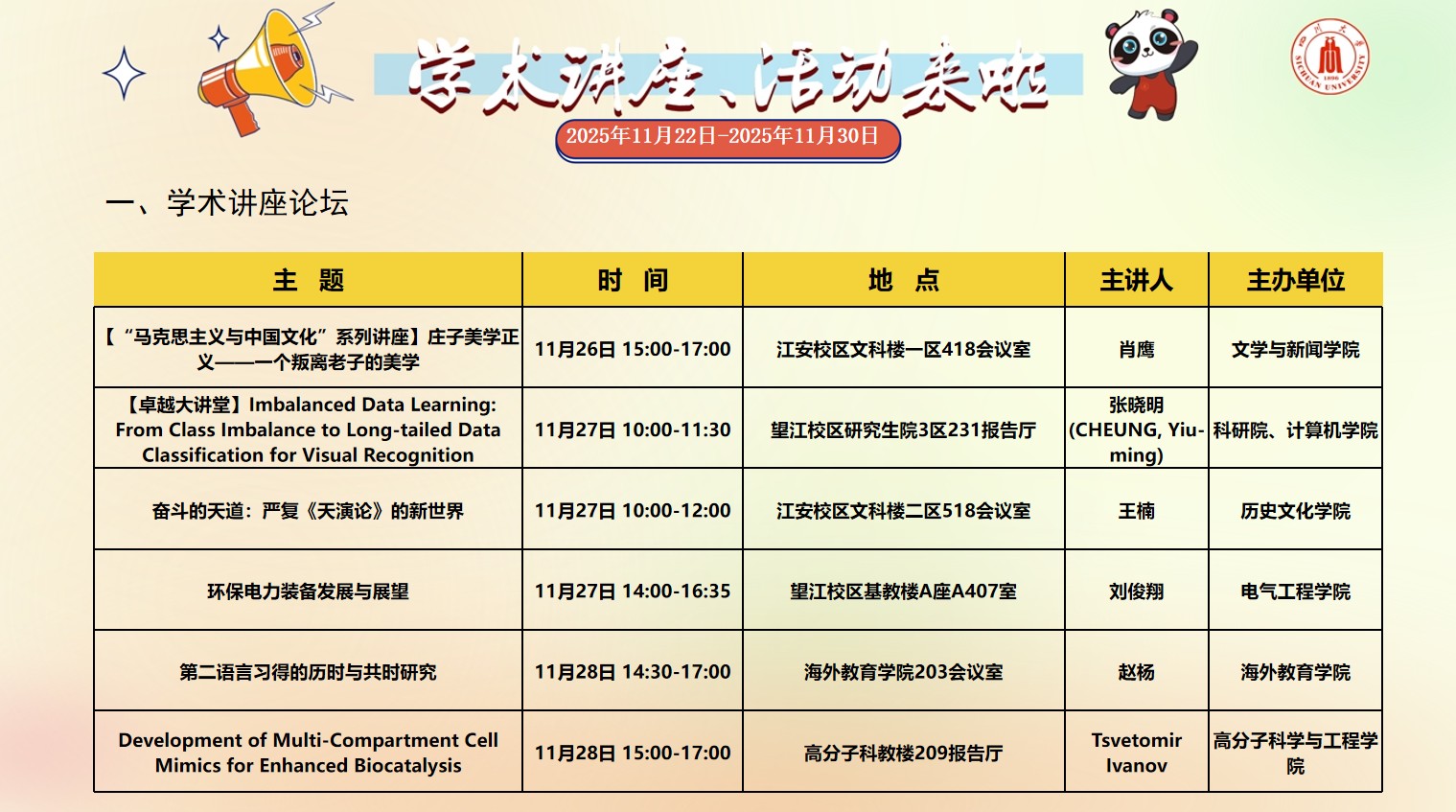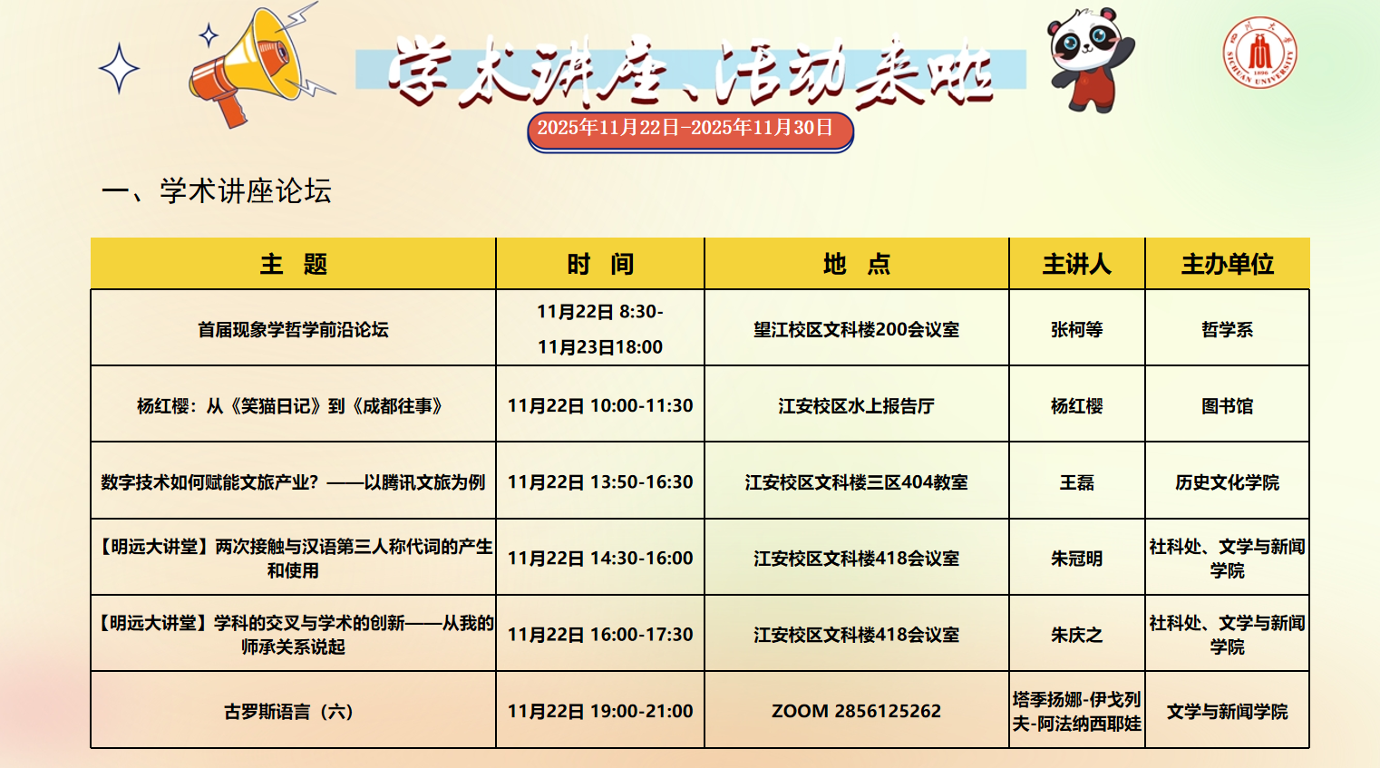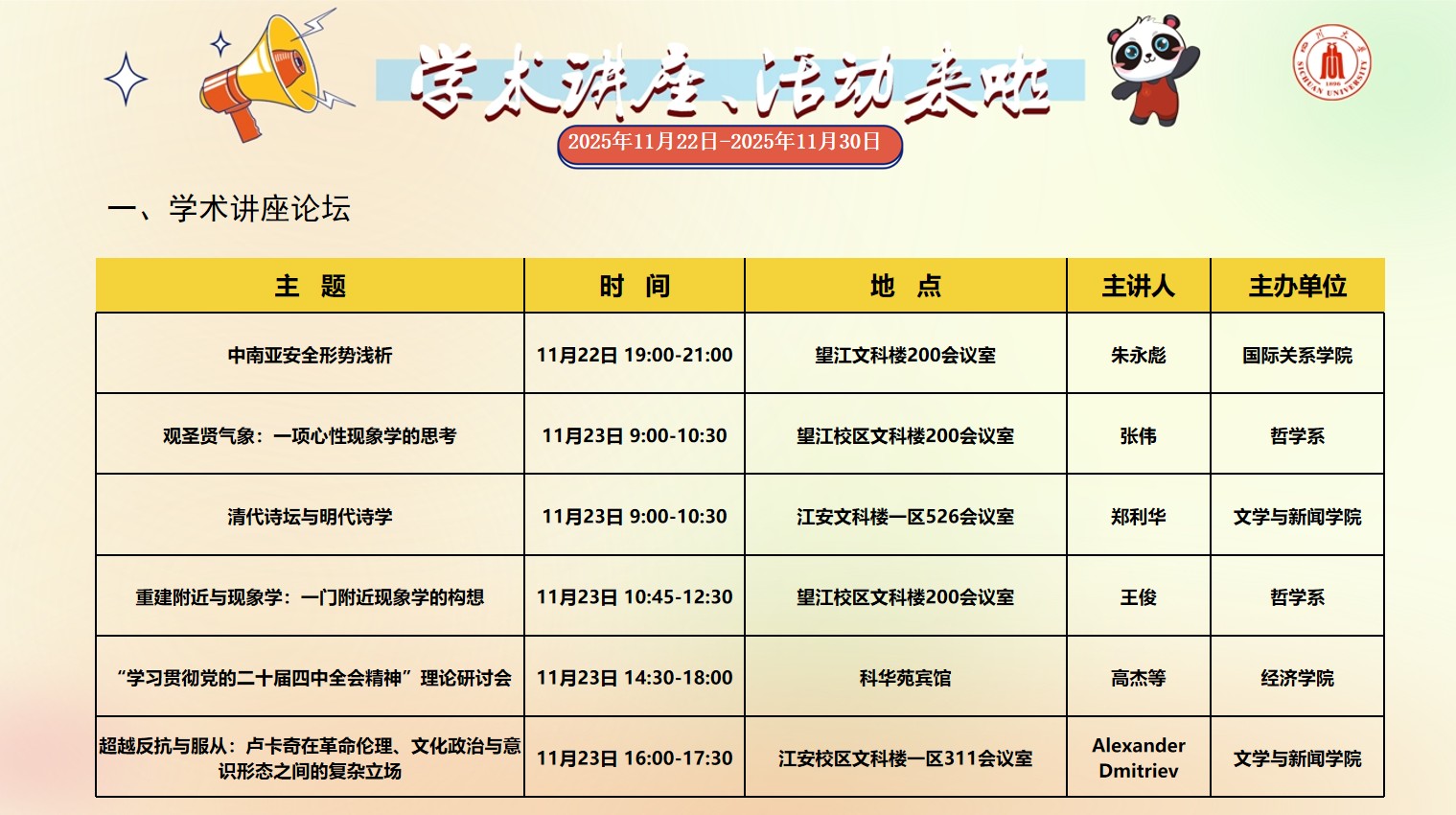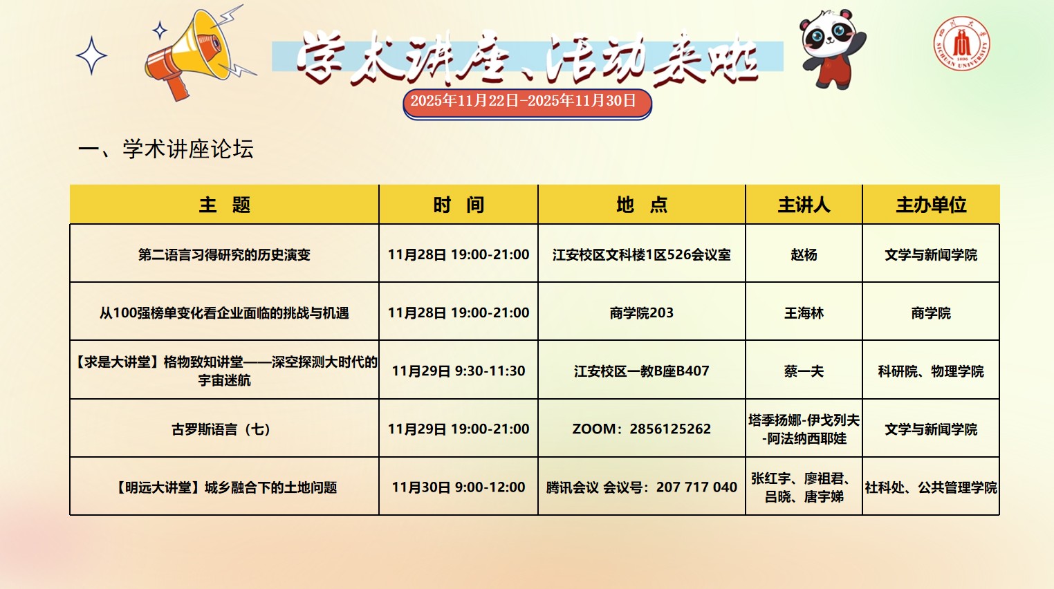 yl23455永利集团2025年11月22日-2025年11月30日学术讲座和校园文化活动预告