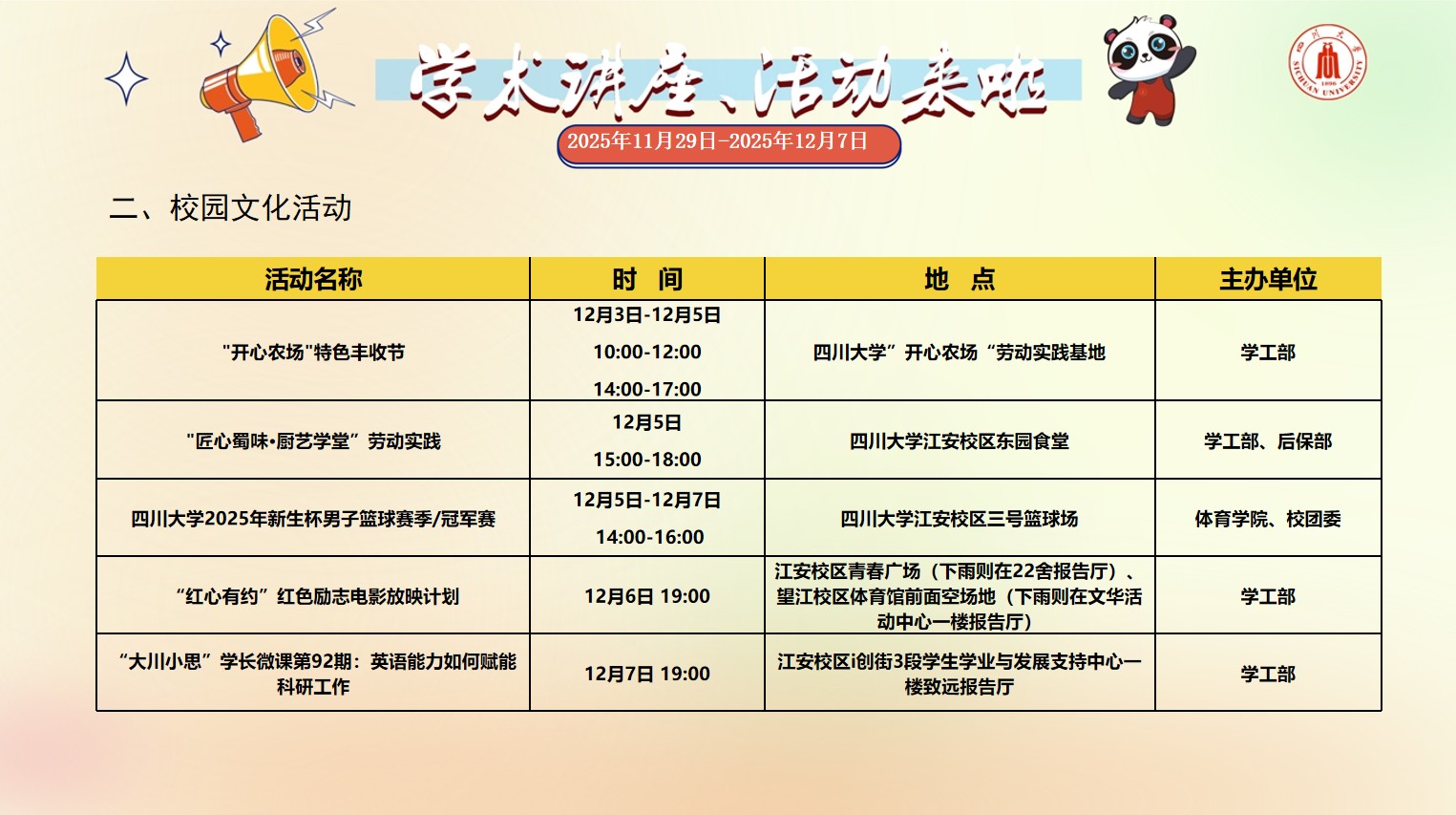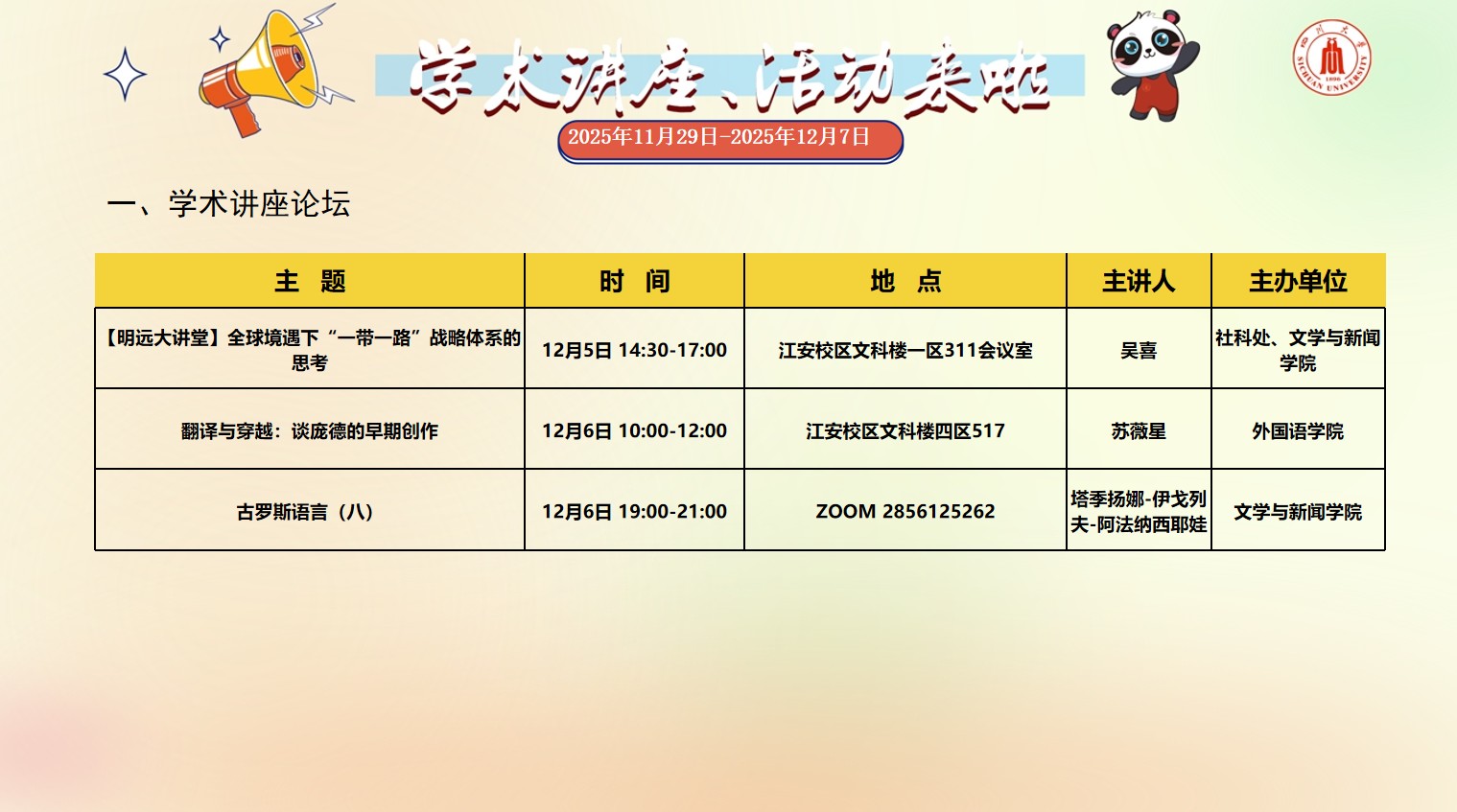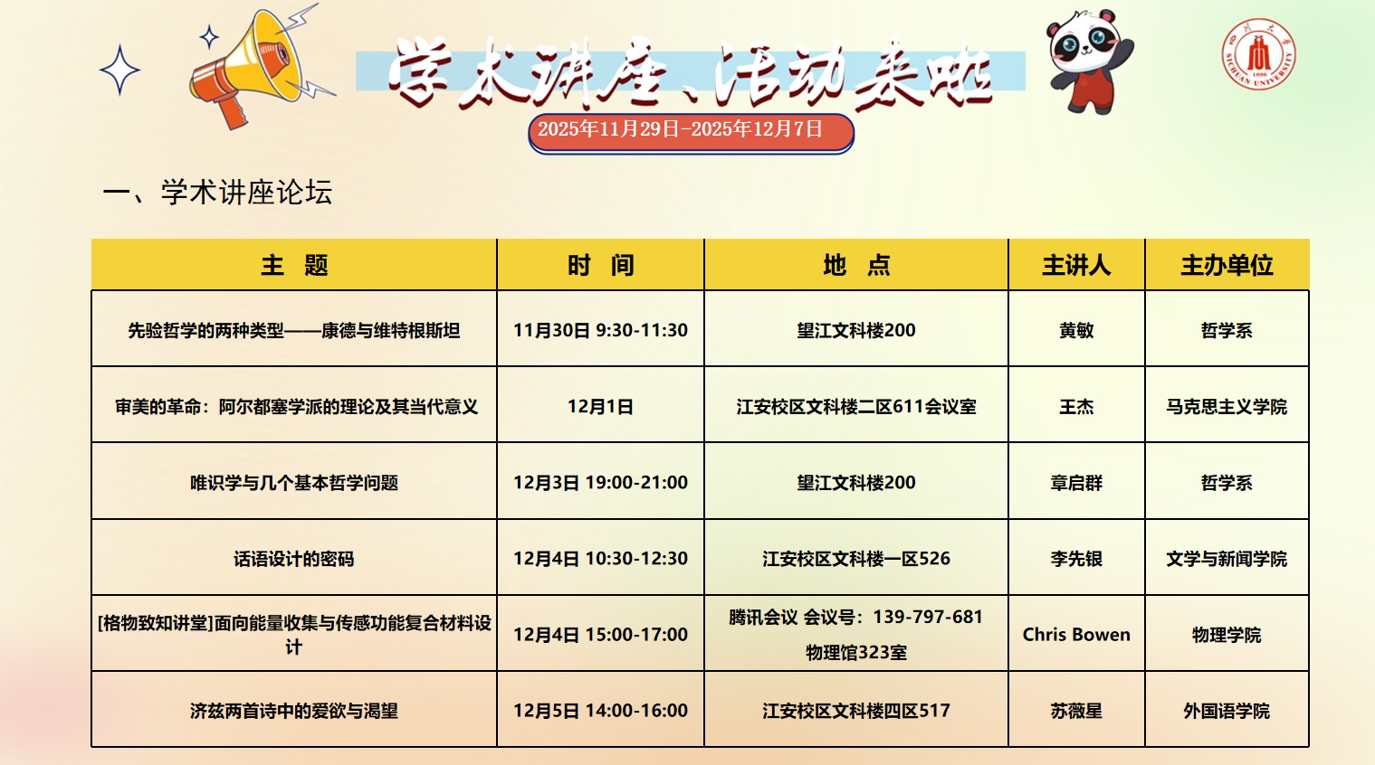 yl23455永利集团2025年11月29日-12月7日学术讲座和校园文化活动预告