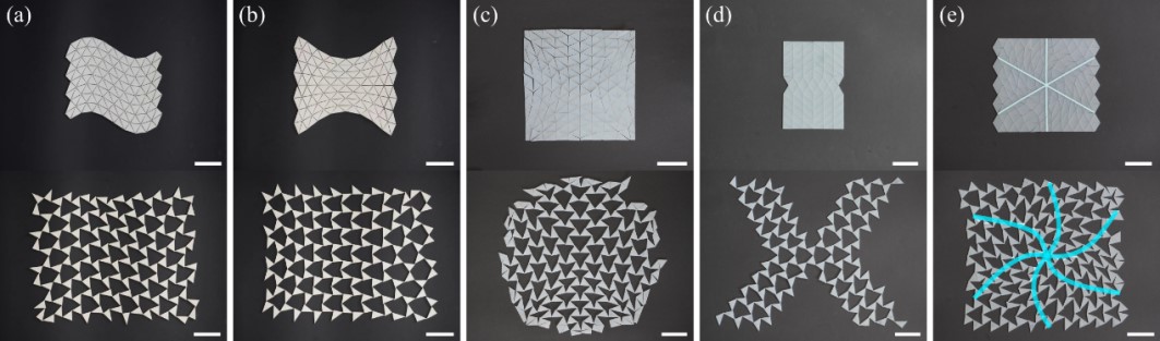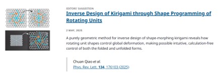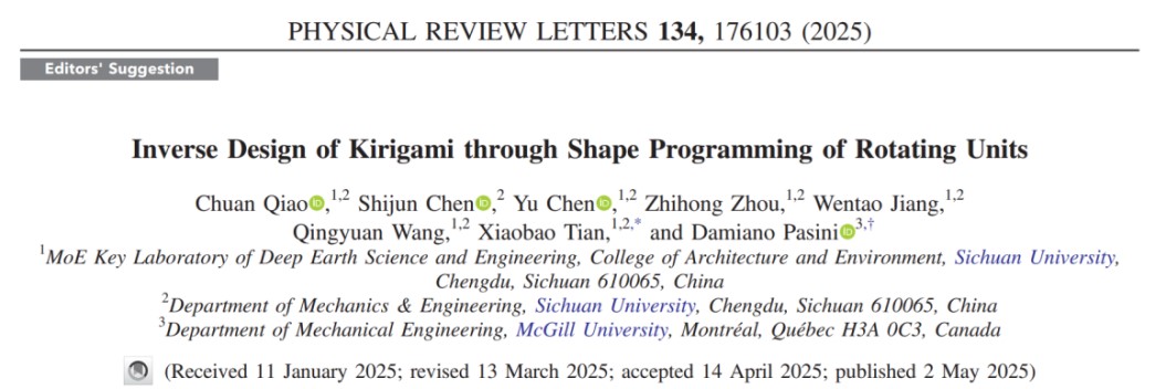 近日,学院力学系王清远教授/蒋文涛教授团队乔川/田晓宝课题组在剪纸超材料领域取得新进展,相关成果“Inverse Design of Kirigami through Shape Programming of Rotating Units”发表在物理领域国际顶尖刊物《Physical Review Letters》。yl23455永利集团深地科学与工程教育部重点实验室为论文第一单位及通讯作者单位。学院力学系青年教师乔川博士为论文第一作者,学院力学系田晓宝教授和麦吉尔大学Damiano Pasini教授为论文共同通讯作者,王清远教授、蒋文涛教授为合作作者。该研究得到了国家自然科学基金、国家重大科技专项、四川省科技计划、the Canada Research Chair Program、NSERC等项目的资助。