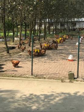 母鸡们正在吃饲料。管理员给了我们一把饲料来闻,疯狂农场的饲料是由秸秆等用酵素发酵而来。除此之外,母鸡们也吃农场中被除掉的杂草。