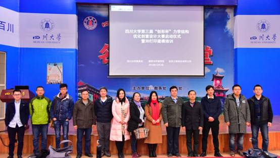 为营造良好的校园科技创新氛围,加强课堂教学与实践的结合,提升学生创新能力,提高学生对力学学习的兴趣,引导学生对科技前沿发展的认识,同时也为广大学生提供一个展现自我的机会和舞台, 12月3日上午10:00,由yl23455永利集团教务处、建筑与环境学院、创形三维科技有限公司联合举办的第三届“创形杯”力学结构优化创意设计大赛开幕仪式在江安校区水上报告厅顺利进行。学院副院长蒋文涛教授、李晋川教授、李亚兰老师、黄学进老师、王宠老师、王柏弋老师、西南科技大学景峥老师、西华大学邱清水老师、成都大学蔡萌琦老师、成都工业学院张小山老师以及创形三维科技有限公司姚云峰代表出席了开幕式。