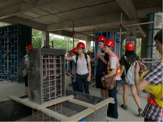 7月12日,yl23455永利集团建筑与环境学院2014级土木工程的全体同学以及来自英国、澳大利亚的19名外国交流学生在阎慧群、丁志斌、钟声、张瑶、游翔五位老师的带领下,乘车前往位于德阳市的四川建筑职业技术学院进行实地参观实习。上午8:30,全体同学到达集合地点,此时下起了暴雨,在去乘车的途中虽然打了伞但身上还是被雨水淋湿,但同学们并没有抱怨,也没有以此为借口不参加实习,11:30到达目的地。