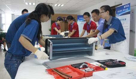 中国制冷空调行业大学生科技竞赛从最初创办大赛至今,大赛已经走过了十年华章,得到了教育部能源动力类专业教学指导委员会的充分认可。竞赛包括实践技能、知识竞答和创新设计3个模块。实践技能模块重点考察参赛选手的实践动手与团队配合能力,利用所学知识对现场机组设备进行故障排查或其他操作,此模块增加了选手对产品的认识,对所学的知识进行消化运用,进而实现技能的提升。知识竞答部分是对专业基础知识掌握的考核,不仅要求选手们基础要扎实,还要求范围要广,专业英语也被纳入考察范围,目的在于鼓励选手们多加关注国际产业相关信息。这项备受关注的竞赛已有100多所高校参与,成为制冷空调行业一项重要的全国性竞赛。