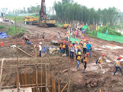 7月5日上午,建环境学院2014级土木工程的全体同学在钟声等指导老师的带领下,前往国色天乡鹭湖宫进行了参观实习。上午10:30,全体同学到达实习地点。集合后,工地现场负责人付总给强调了安全的重要性以及如何正确佩戴安全帽等知识,带领同学们参观了整个项目,现场工作人员详细的介绍了项目的占地面积、施工进度、建设理念等具体情况。整个过程中,同学们积极主动参观学习,咨询了关于构造柱、框架梁、大型机械设备用途等各个方面的问题。