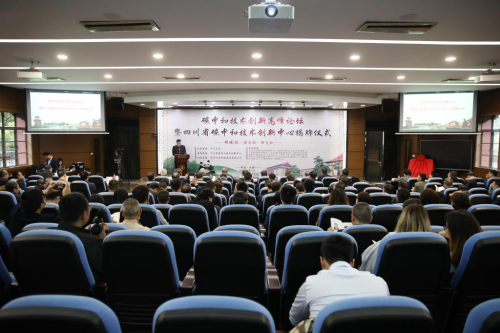 在与会嘉宾的共同见证下,田云辉副厅长和褚良银副校长为四川省碳中和技术创新中心揭牌。