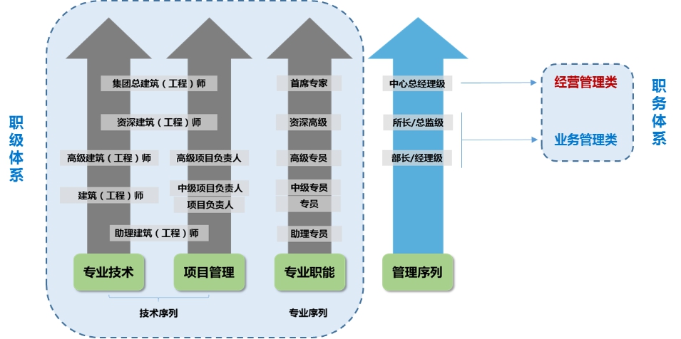 集团重视各级人才的赋能与成长,秉承“专项成长,综合提升”的思路,培育复合型建筑设计英才。集团设置“五级三通道”的人才成长路径,2-3年成为专业负责人,3-5年成为中基层管理干部。完善透明的职务和职级体系,助力每一个怀揣梦想的你。