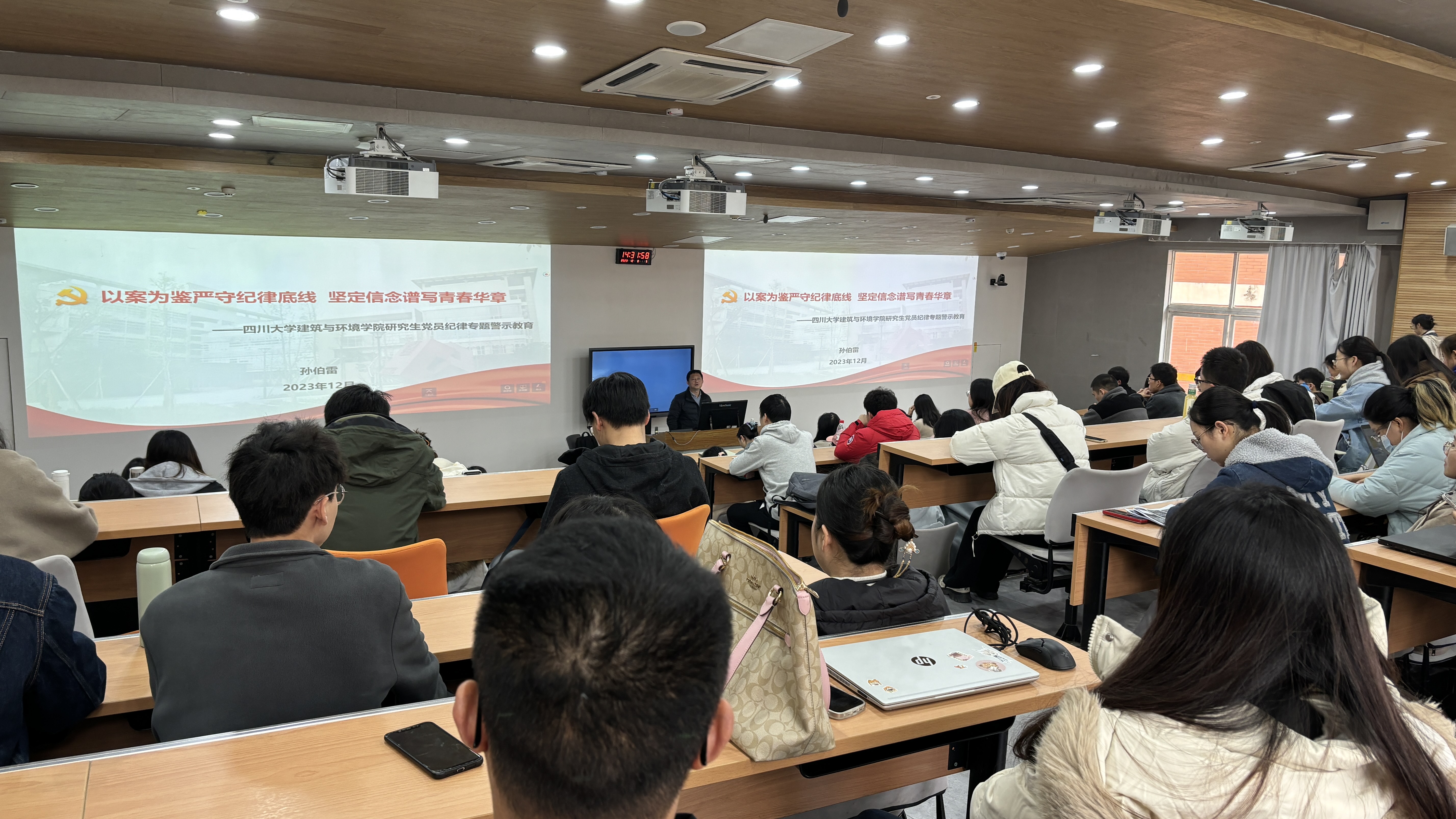为进一步强化和推进学院研究生党员队伍建设,切实提高研究生党员的先进性和纯洁性,时刻筑牢信仰之基、绷紧纪律之弦,12月8日下午,学院在望江校区基础教学楼C101教室举办了研究生党员纪律专题警示教育学习会。学习会由学院党委副书记兼纪委书记孙伯雷主讲,学院研究生辅导员、研究生党支部书记和望江校区研究生党员共计120余人参加了此次警示教育学习会。