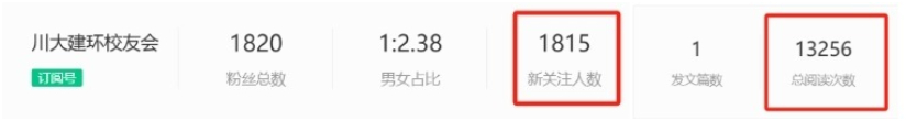 “川大建环校友会”公众号发布首篇原创推文当天,关注人数增长1815人,推文总阅读次数高达13256次,体现出校友们对学院动态的高度关注和对推文内容的深度认可。