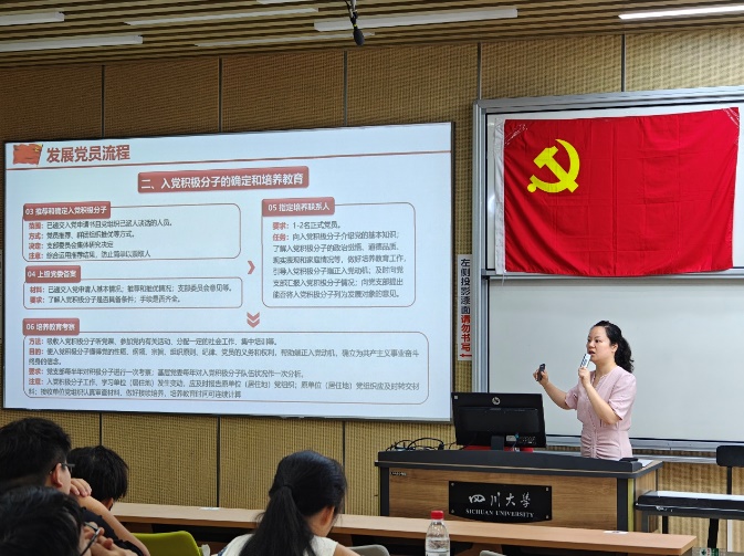 培训第二讲由学院学生党建负责老师周琦颖主讲。周琦颖以《中国共产党发展党员工作细则》为题,分阶段详解入党的5大环节25个步骤,重点梳理了各个环节的规范要求。周琦颖希望入党积极分子以培训为起点,主动学习党的理论,端正入党动机,规范自身言行,强化责任担当,以实际行动积极向党组织靠拢。