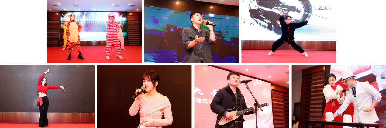 来自学院各年级的学生在晚会上也通过节目的方式向学院老师们表达了真诚的祝福。袁耀等跳的集体舞《猪猪侠》,范文浩独唱的《无名的人》,段连华同学的武术《翩若惊鸿》,江婉怡的独舞《无人区玫瑰》,学校学生合唱团团员刘木耳的独唱《棠梨煎雪》,岳华俊的吉他弹唱《给你》以及许天赫的魔术《三仙归洞》,给晚会带来了不少惊艳,展现了学院在“五育并举”方面所取得成绩,也让与会教工们惊叹建环学子的多才多艺与青春风采。