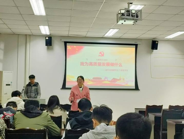 首先,支部书记高倩、副书记何凤飞介绍了高质量发展的重要意义以及实现科技强国的迫切性、关键性和促进发展大局的作用。结合习近平总书记在重要节日进行的讲话具体阐述了中国青年的奋斗目标和发展方向,寄语支部研究生党员“立大志,明大德,成大才,担大任”,用心感应时代脉搏,积极助力高质量发展。