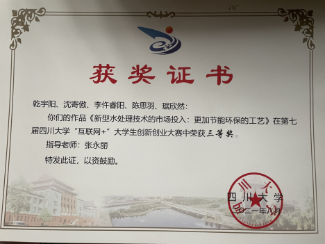 2021年,给排水教研室教师指导的学生参加了多项学科竞赛,包括:第十四届全国大学生节能减排社会实践与科技竞赛、第七届yl23455永利集团“互联网+”大学生创新创业大赛等。由于疫情影响,我校有3组学生已报名参加的第5届“深水杯”全国大学生科技创新大赛延期至2022年举办。在已举办的学科竞赛中,共获全国三等奖3项、校级三等奖1项。