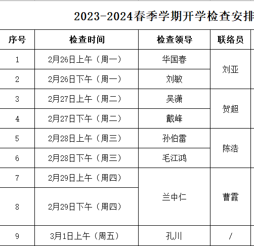 为确保新学期本科教学工作有序开展、保证教学质量,院在2023—2024学年季学期加强教学监控与管理,根据学校关于开展开学教学检查工作的文件精神和工作要求,组织学院领导班子、学院教学管理人员、教学督导人员对学院开学初教学工作安排、课堂开展状况、教材保障及选用情况等进行了全方位检查。