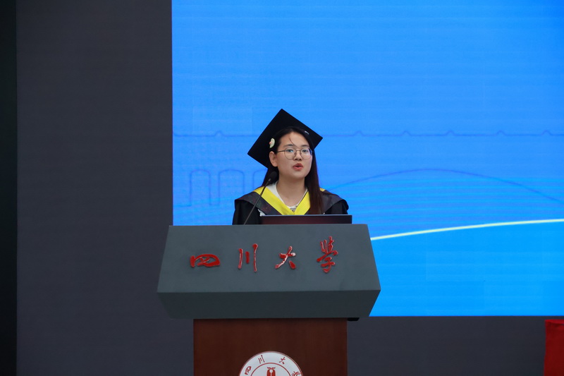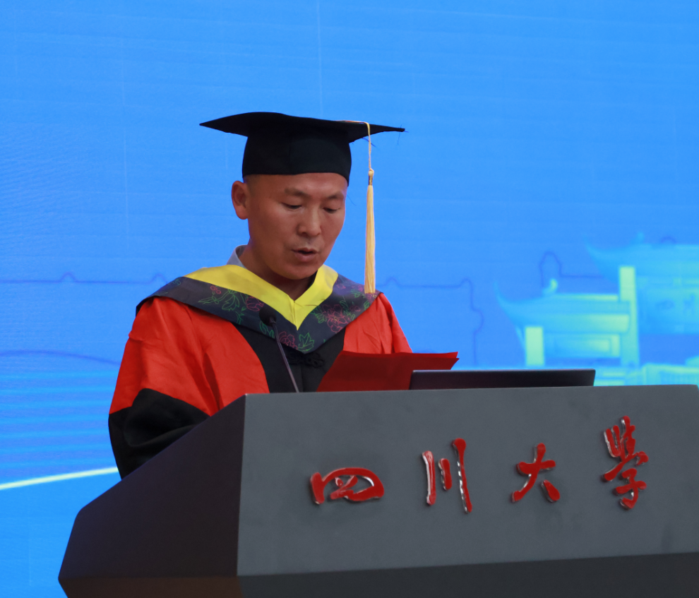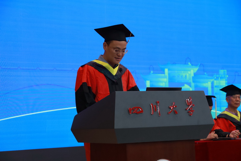 城乡规划专业康澳同学作为研究生毕业生代表发言。他分享了在学院求学八年的故事与选择,感恩母校的老师与同学,表示在奔赴城乡建设与生态保护广袤天地中将坚守初心,在平凡的岗位上挥洒青春热血。