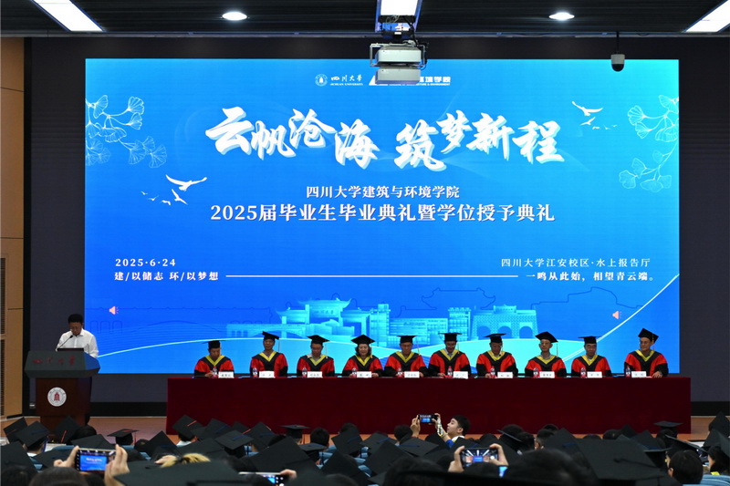 6月24日下午,学院在江安校区水上报告厅举行2025届毕业生毕业典礼暨学位授予仪式。学院党委书记兰中仁,院长戴峰,学术院长熊峰,副院长刘敏、刘永杰,工会主席楚英豪,环境科学与工程系教师代表唐亚,建筑系教师代表罗隽,土木工程系教师代表戴靠山,力学科学与工程系教师代表任利,毕业班辅导员杨胜、翟盼盼、刘芸、李潇,2025届毕业生和家长代表参加典礼。典礼由学院党委副书记兼纪委书记孙伯雷主持。
